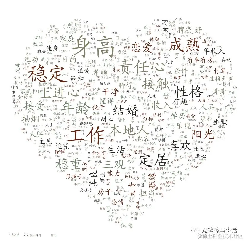 从上图可以看出来,女性对自己的另一半的期望主要有,希望他具备责任心和上进心,成熟稳重并且脾气好等等,当然除此之外,收入、有房有车和身高这种硬性指标也在女性的考虑范围之内,不过女性最主要看重的还是另一半的品行和性格。