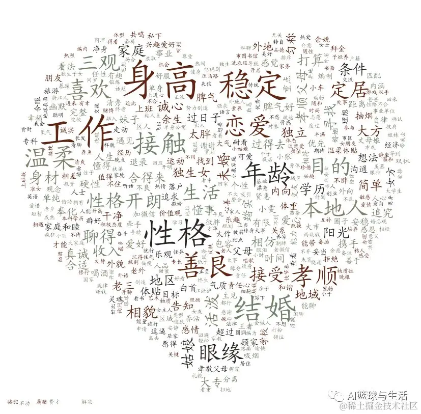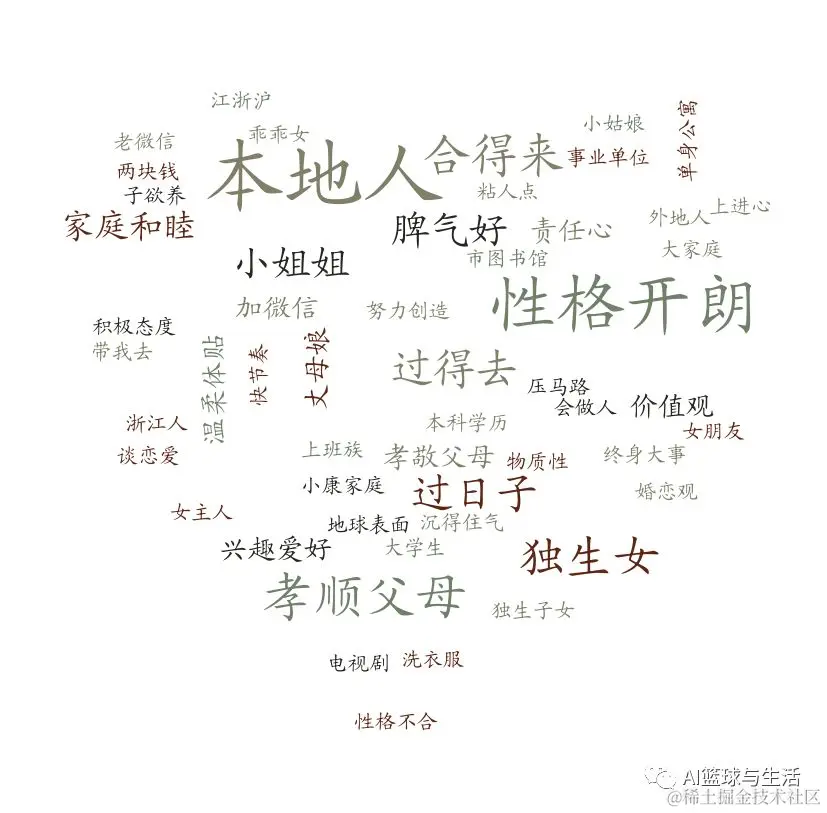而从择偶标准来分析的话,从男性对另一半的期许,以及女性对另一半的期许,小编统计了相关的词频,并用wordcloud画了词云图,如下图所示