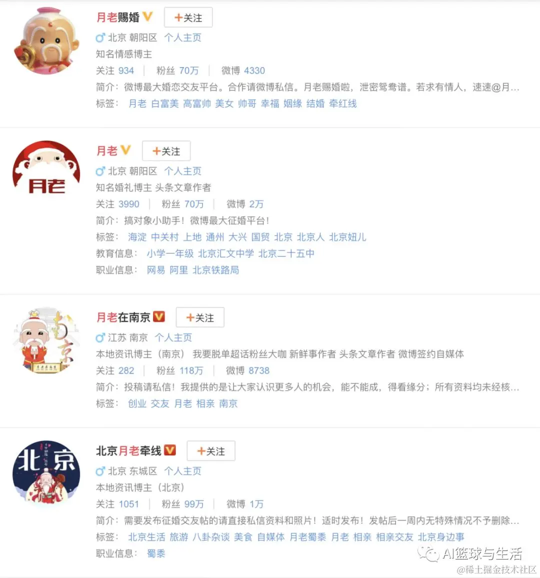 首先小编从微博上爬取了江浙沪一带相对正规的相亲平台,里面有相亲者的一些相关信息,包括了年龄,身高,收入,户籍等等,根据所爬取到的数据,再进行进一步的分析和挖掘。