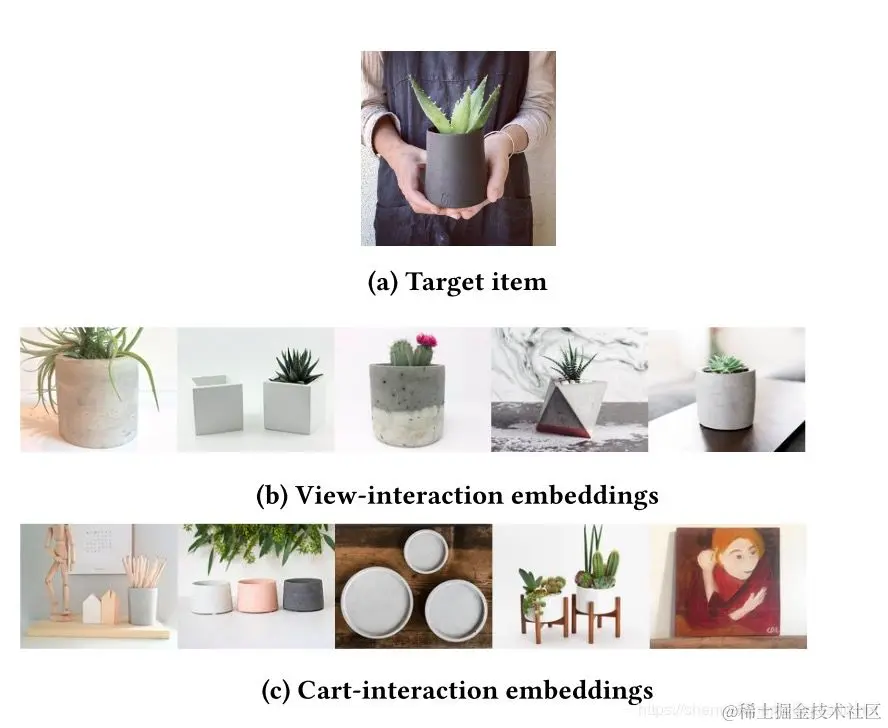 如图所示,对于同样的目标物品,一盆绿植,对于看过该物品的用户,我们倾向于为他推荐相似的物品,可以作为替代的物品。对于购买了它的用户,我们倾向推荐一些小摆件,或者花盆等相关的物品。
