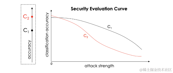 C1和C2是两个模型。 很明显,C1一开始并不是很准确,但是随着攻击强度的增加,它在抵抗攻击方面也做得更好。 你选择C1还是C2作为ML模型?\
