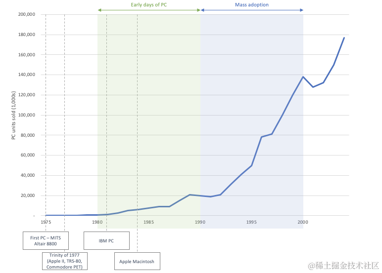 让我们上一节历史课,重访 PC 市场。第一台个人电脑(Altair 8800)于 1975 年发布,随后在接下来的 10 年里进行了一系列的创新,最终在 1984 年推出了 Apple Macintosh。随之而来的是一波爆炸性的采用浪潮,在整个 90 年代一直持续到 2000 年:\