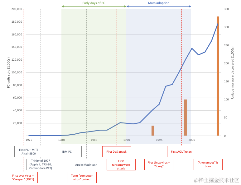 1989 年,Robert Morris 尝试使用 Unix sendmail,并构建了一个可以自我复制的蠕虫,然后将其发送到 internet 上。一开始只是一个简单的实验,结果变成了第一次 DoS 攻击,造成的损失估计在 10 万到 1000 万美元之间,并使整个互联网慢了好几天(当然现在是不可想象的)。随后,1989 年发生了第一次勒索软件攻击,1996 年出现了第一个 Linux 病毒(“Staog”),1998 年出现了第一个 AOL 木马。
