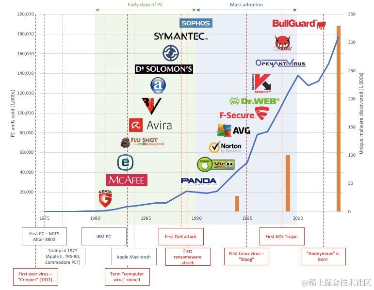 1987 年,Andreas Luning 和 Kai Figge 为 Atari ST 平台开发了第一个抗病毒产品。同年,McAffee、NOD、Flu Shot 和 Anti4us 都出生了 —— 在接下来的 20 年里,更多的安全类产品诞生了: