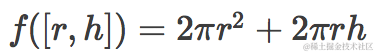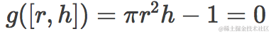 目标函数为圆柱体的表面积,约束条件为圆柱体体积为1。变量为r、h,这是一个带等式约束的二维优化问题。根据等式约束条件,可得 ,代入目标函数得到一维搜索: