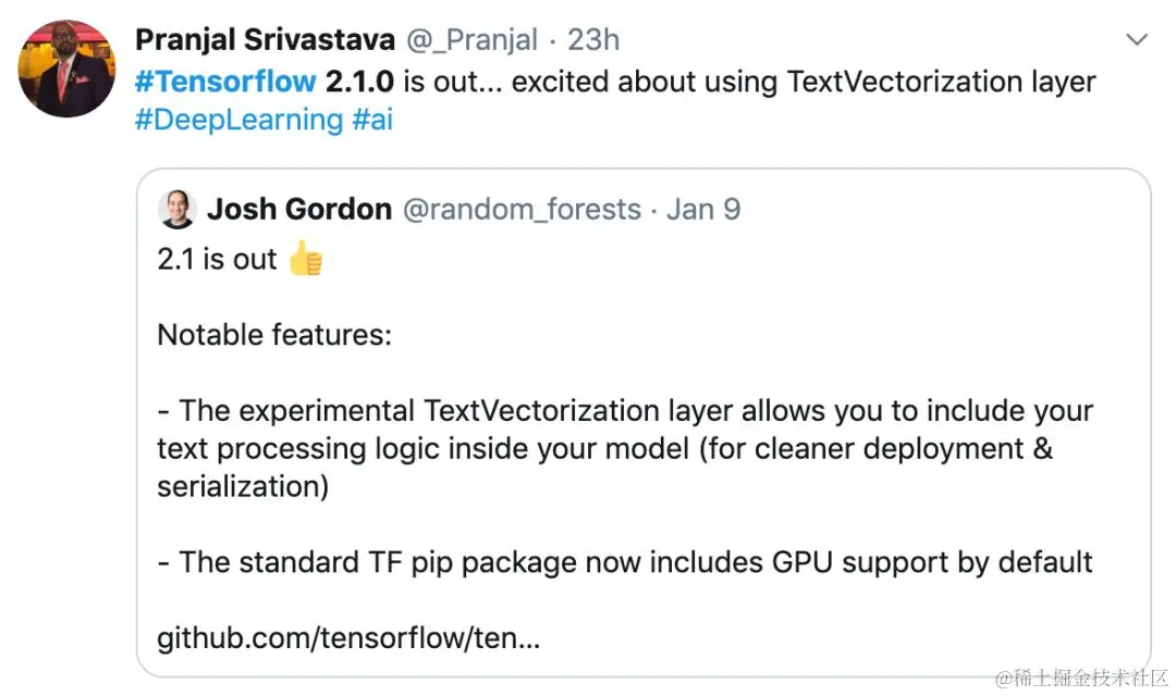 除了以上重要更新外,TensorFlow 2.1.0 还进行了多项错误修复与更改,具体可在发行说明中查看 (github.com/tensorflow/…