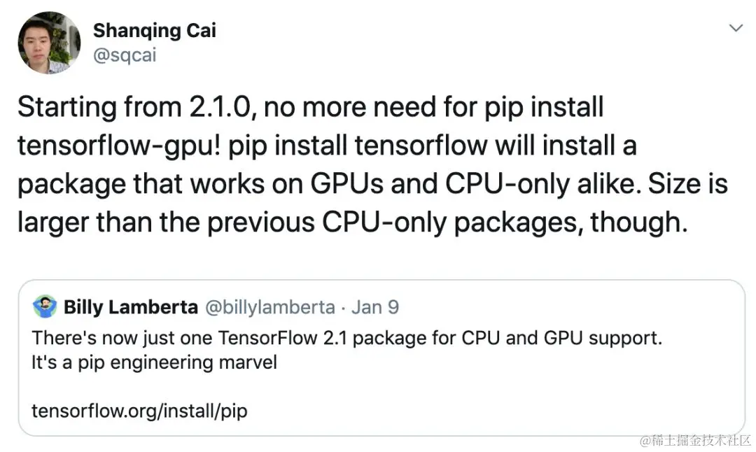 另外,官方还介绍,该 tensorflow pip 软件包是用 CUDA 10.1 和 cuDNN 7.6 建立的。
