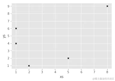 df = pd.DataFrame({"xs": [1, 5, 2, 8, 1], "ys": [4, 2, 1, 9, 6]})