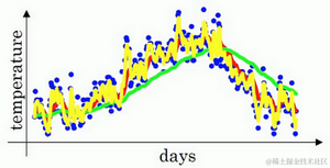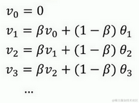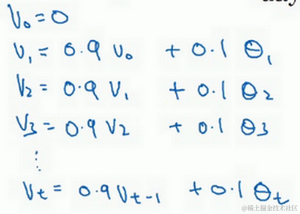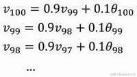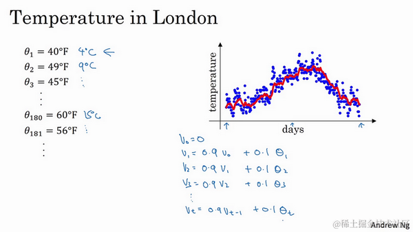 第二天,又可以获得一个加权平均数,0.9乘以之前的值加上当日的温度0.1倍,即 ,以此类推。