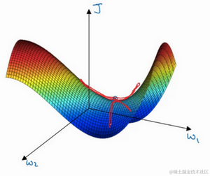 这是曾经人们在想到局部最优时脑海里会出现的图,也许你想优化一些参数,我们把它们称之为 和 ,平面的高度就是损失函数。在图中似乎各处都分布着局部最优。梯度下降法或者某个算法可能困在一个局部最优中,而不会抵达全局最优。如果你要作图计算一个数字,比如说这两个维度,就容易出现有多个不同局部最优的图,而这些低维的图曾经影响了我们的理解,但是这些理解并不正确。事实上,如果你要创建一个神经网络,通常梯度为零的点并不是这个图中的局部最优点,实际上成本函数的零梯度点,通常是鞍点。