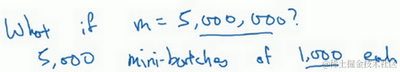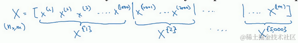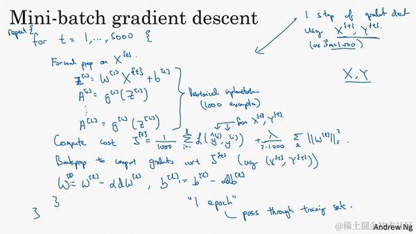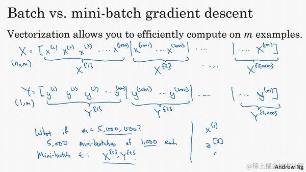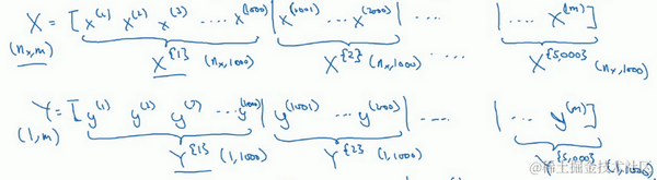 你可以把训练集分割为小一点的子集训练,这些子集被取名为mini-batch,假设每一个子集中只有1000个样本,那么把其中的 到 取出来,将其称为第一个子训练集,也叫做mini-batch,然后你再取出接下来的1000个样本,从 到 ,然后再取1000个样本,以此类推。