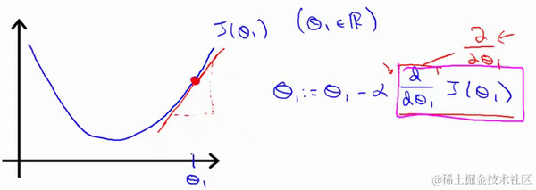 对于这个问题,求导的目的,基本上可以说取这个红点的切线,就是这样一条红色的直线,刚好与函数相切于这一点,让我们看看这条红色直线的斜率,就是这条刚好与函数曲线相切的这条直线,这条直线的斜率正好是这个三角形的高度除以这个水平长度,现在,这条线有一个正斜率,也就是说它有正导数,因此,我得到的新的 , 更新后等于 减去一个正数乘以 。