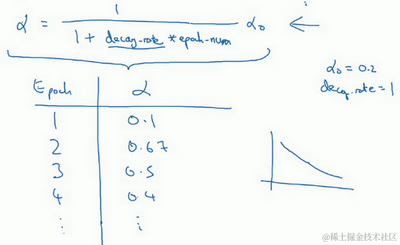 你应该拆分成不同的mini-batch,第一次遍历训练集叫做第一代。第二次就是第二代,依此类推,你可以将 学习率设为(decay-rate称为衰减率,epoch-num为代数, 为初始学习率),注意这个衰减率是另一个你需要调整的超参数。