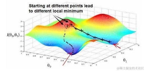梯度下降背后的思想是:开始时我们随机选择一个参数的组合 ,计算代价函数,然后我们寻找下一个能让代价函数值下降最多的参数组合。我们持续这么做直到找到一个局部最小值(local minimum),因为我们并没有尝试完所有的参数组合,所以不能确定我们得到的局部最小值是否便是全局最小值(global minimum),选择不同的初始参数组合,可能会找到不同的局部最小值。