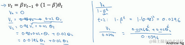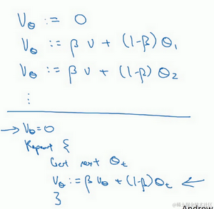 现在解释一下算法,可以将 , , 等等写成明确的变量,不过在实际中执行的话,你要做的是,一开始将 初始化为0,然后在第一天使 ,然后第二天,更新 值, ,以此类推,有些人会把 加下标,来表示 是用来计算数据的指数加权平均数。