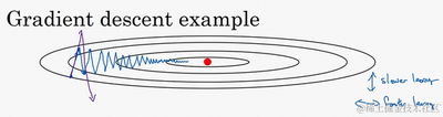 回忆一下我们之前的例子,如果你执行梯度下降,虽然横轴方向正在推进,但纵轴方向会有大幅度摆动,为了分析这个例子,假设纵轴代表参数 ,横轴代表参数 ,可能有 , 或者其它重要的参数,为了便于理解,被称为 和 。