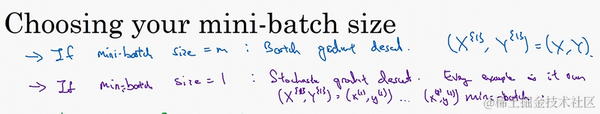 实际上你选择的mini-batch大小在二者之间,大小在1和 之间,而1太小了, 太大了,原因在于如果使用batch梯度下降法,mini-batch的大小为 ,每个迭代需要处理大量训练样本,该算法的主要弊端在于特别是在训练样本数量巨大的时候,单次迭代耗时太长。如果训练样本不大,batch梯度下降法运行地很好。