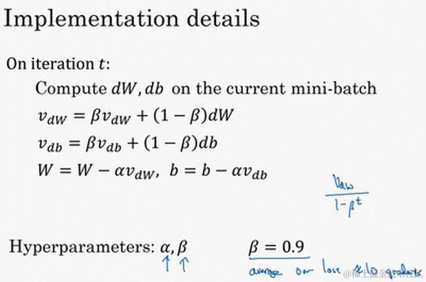 所以你有两个超参数,学习率 以及参数 , 控制着指数加权平均数。 最常用的值是0.9,我们之前平均了过去十天的温度,所以现在平均了前十次迭代的梯度。实际上 为0.9时,效果不错,你可以尝试不同的值,可以做一些超参数的研究,不过0.9是很棒的鲁棒数。那么关于偏差修正,所以你要拿 和 除以 ,实际上人们不这么做,因为10次迭代之后,因为你的移动平均已经过了初始阶段。实际中,在使用梯度下降法或动量梯度下降法时,人们不会受到偏差修正的困扰。当然 初始值是0,要注意到这是和 拥有相同维数的零矩阵,也就是跟 拥有相同的维数, 的初始值也是向量零,所以和 拥有相同的维数,也就是和 是同一维数。