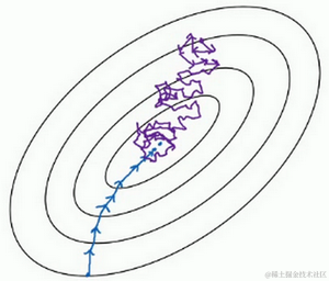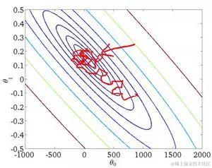 相反,在随机梯度下降法中,从某一点开始,我们重新选取一个起始点,每次迭代,你只对一个样本进行梯度下降,大部分时候你向着全局最小值靠近,有时候你会远离最小值,因为那个样本恰好给你指的方向不对,因此随机梯度下降法是有很多噪声的,平均来看,它最终会靠近最小值,不过有时候也会方向错误,因为随机梯度下降法永远不会收敛,而是会一直在最小值附近波动,但它并不会在达到最小值并停留在此。
