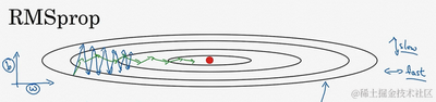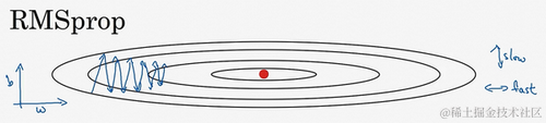 所以,你想减缓 方向的学习,即纵轴方向,同时加快,至少不是减缓横轴方向的学习,RMSprop算法可以实现这一点。