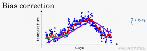 计算移动平均数的时候,初始化 , ,但是 ,所以这部分没有了( ),所以 ,所以如果一天温度是40华氏度,那么 ,因此得到的值会小很多,所以第一天温度的估测不准。