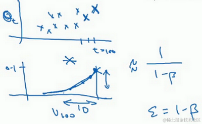 又因此当 的时候,我们说仿佛你在计算一个指数加权平均数,只关注了过去10天的温度,因为10天后,权重下降到不到当日权重的三分之一。