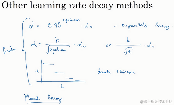 比如,这个叫做指数衰减,其中 相当于一个小于1的值,如 ,所以你的学习率呈指数下降。