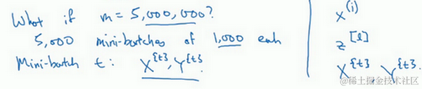 接下来我要说一个新的符号,把 到 称为 , 到 称为 ,如果你的训练样本一共有500万个,每个mini-batch都有1000个样本,也就是说,你有5000个mini-batch,因为5000乘以1000就是5000万。