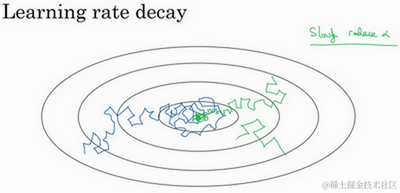 所以慢慢减少 的本质在于,在学习初期,你能承受较大的步伐,但当开始收敛的时候,小一些的学习率能让你步伐小一些。
