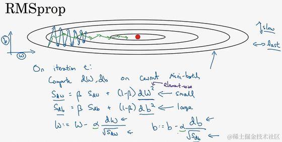 接着RMSprop会这样更新参数值, , ,我们来理解一下其原理。记得在横轴方向或者在例子中的 方向,我们希望学习速度快,而在垂直方向,也就是例子中的 方向,我们希望减缓纵轴上的摆动,所以有了 和 ,我们希望 会相对较小,所以我们要除以一个较小的数,而希望 又较大,所以这里我们要除以较大的数字,这样就可以减缓纵轴上的变化。你看这些微分,垂直方向的要比水平方向的大得多,所以斜率在 方向特别大,所以这些微分中, 较大, 较小,因为函数的倾斜程度,在纵轴上,也就是b方向上要大于在横轴上,也就是 方向上。 的平方较大,所以 也会较大,而相比之下, 会小一些,亦或 平方会小一些,因此 会小一些,结果就是纵轴上的更新要被一个较大的数相除,就能消除摆动,而水平方向的更新则被较小的数相除。