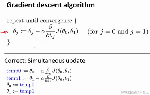 在梯度下降算法中,这是正确实现同时更新的方法。这里不打算解释为什么你需要同时更新,同时更新是梯度下降中的一种常用方法。我们之后会讲到,同步更新是更自然的实现方法。当人们谈到梯度下降时,他们的意思就是同步更新。