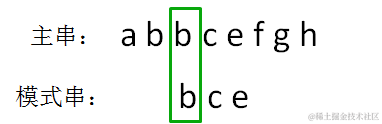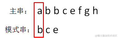 显然,主串的首位字符是a,模式串的首位字符是b,两者并不匹配。