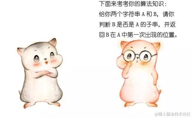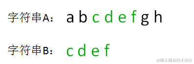 在上图中,字符串B是A的子串,B第一次在A中出现的位置下标是2(字符串的首位下标是0),所以返回 2。