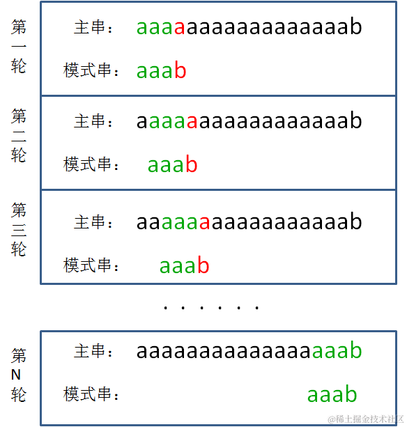 上图的情况,在每一轮进行字符匹配时,模式串的前三个字符a都和主串中的字符相匹配,一直检查到模式串最后一个字符b,才发现不匹配: