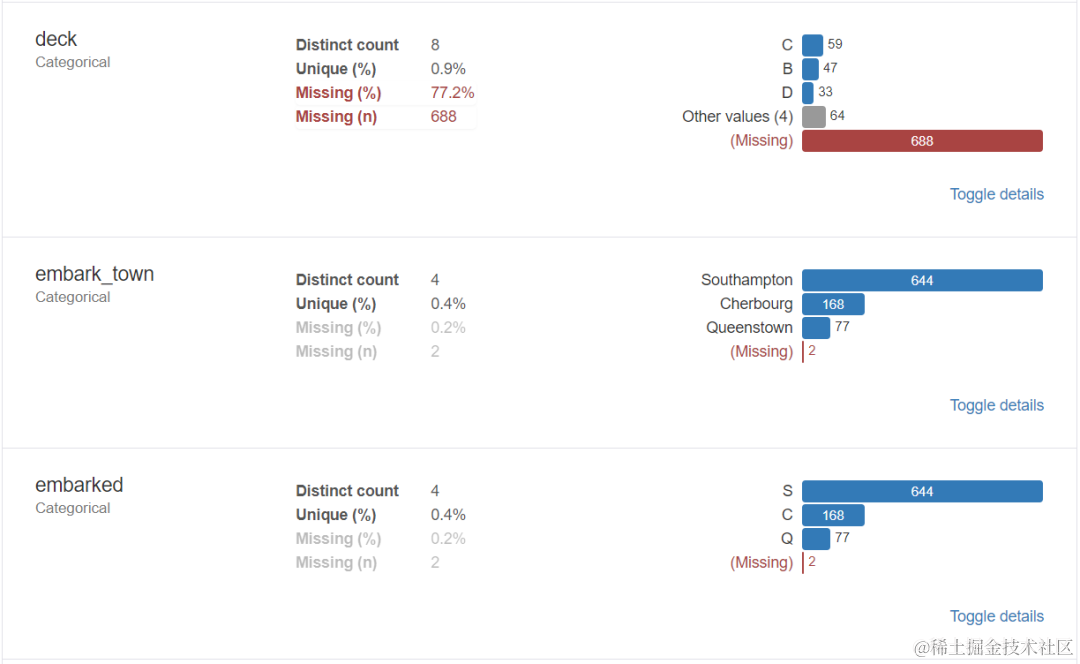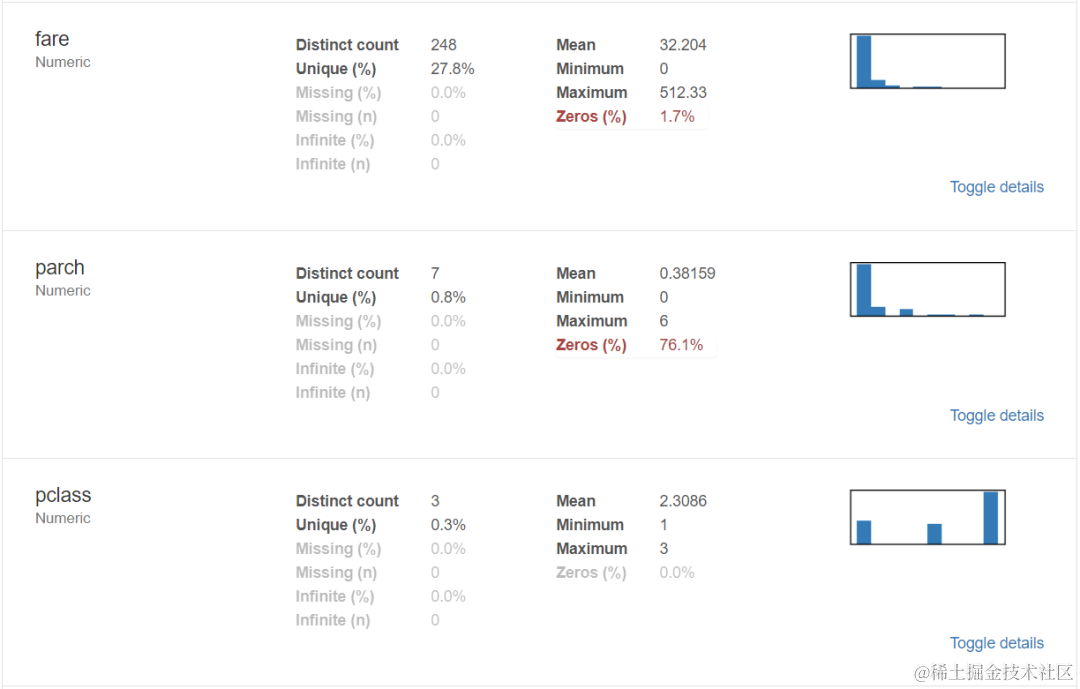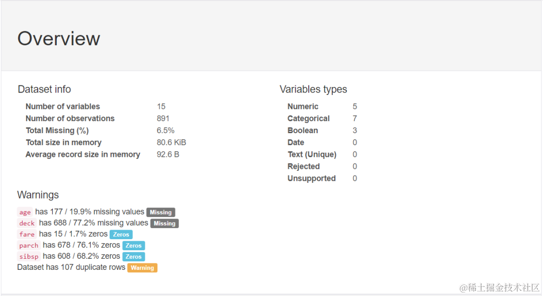 对于数据集的每一列,pandas_profiling会提供以下统计信息: