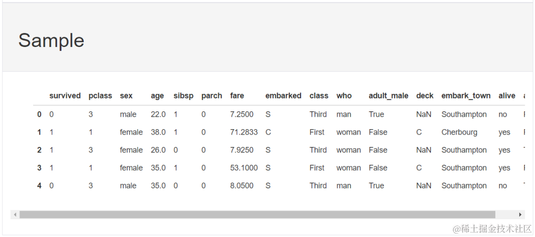 # 导入相关库import seaborn as snsimport pandas as pdimport pandas_profiling as ppimport matplotlib.pyplot as plt# 加载泰坦尼克数据集data = sns.load_dataset('titanic')data.head()