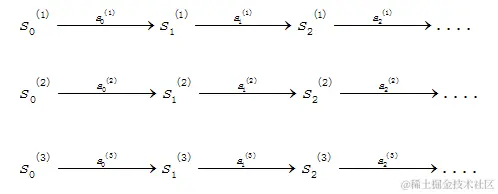 其中 表示 步,第 条转移路径对应的状态, 是 状态下执行的动作,每一条转移路径中状态数都是有限的,在实际过程中,每一个状态转移路径都要进入终结状态。如果我们获得了很多上面的转移路径,那么我们就可以来估计参数 。
