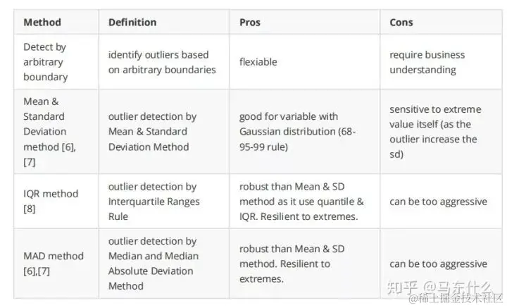 这里列出的所有方法都是用于单变量异常点检测的。多元孤立点检测超出了本指南的范围。(一般特征工程阶段也比较少考虑多维的异常点检测。。。因为太麻烦而复杂了)