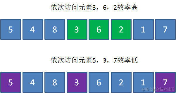 在访问内存数据时,对于顺序存储的数据,读写效率往往是最高的。根据CPU的空间局部性原理,CPU在每次访问数据的时候,会把内存中相邻的数据也一并存入缓存。这样一来,CPU以后再访问邻近的数据就不需要重新访问内存,而是访问CPU缓存,从而大大提升了程序执行的效率。