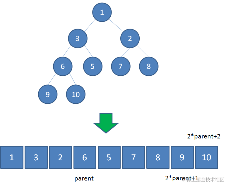 在堆排序的过程中,常常需要父子节点之间进行比较和交换,而父子节点在数组中的位置并不是相邻,而是相差两倍左右:\