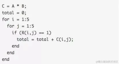 假设有两个矩阵 ,其中 是5x3, 是3x5。它们的乘积是 ,一个5x5矩阵。此外,还有一个5x5矩阵R,其中每个条目都是0或1。你想找到所有元素 的和,对应的 是1,忽略所有 的元素 。一种方法是使用以下代码: