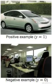 假设您正在构建一个对象分类器,它将图像作为输入,并将该图像识别为包含汽车(y=1y=1)或不包含汽车(y=0y=0)。例如,这里有正例和一个负例:
