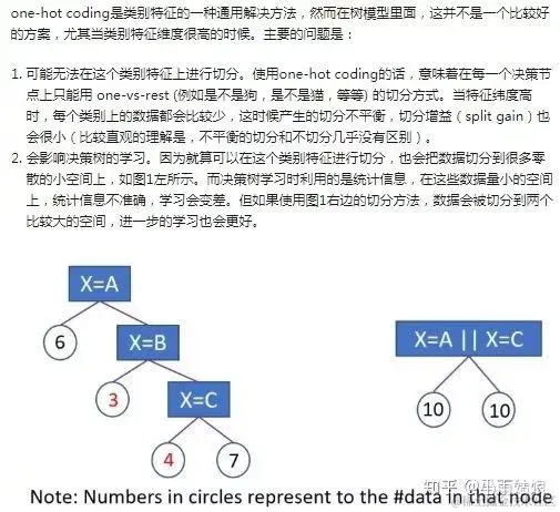 对于无序的离散特征,实战中使用 OneHot, Hashing, LeaveOneOut, and Target encoding 方法效果较好,但是使用OneHot时要避免高基类别的特征以及基于决策树的模型,理由如下图所示: