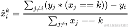 这个方法类似于SUM的方法,只是在计算训练集每个样本的特征值转换时都要把该样本排除(消除特征某取值下样本太少导致的严重过拟合),在计算测试集每个样本特征值转换时与SUM相同。可见以下公式: