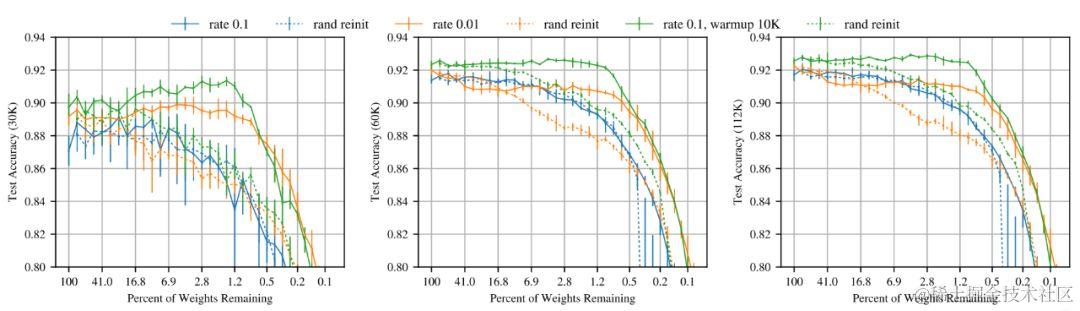 如上图所示为横轴表示保留的权重,数轴表示准确度,图例展示的是学习率。每一种颜色的实线表示采用「有效初始化」的子网络,而虚线表示随机初始化。通过绿色实线、绿色虚线以及蓝色实线,我们可以明确地看出来研究者找到了「winning tickets」。