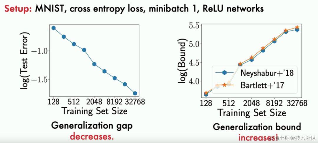 首先,泛化边界竟然随着训练集的增长而增长,这是非常有问题的。因为按照我们的直观理解,当数据集无穷大时,训练误差和测试误差之间差距应该减少到零。Vaishnavh 说:「即使我们观察到随着数据集的增加,测试误差是正常减少的,但泛化边界却反常地扩大。」