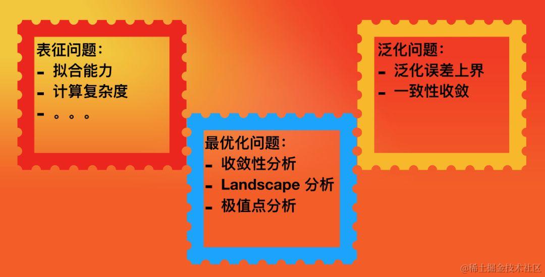 有了表征能力,那也只是具备了拟合潜力,深度学习还需要找到一组足够好的极值点,这就是模型的最优解。不同神经网络的「最优化 Landscape」是什么样的、怎样才能找到这种高维复杂函数的优秀极值点、极值点的各种属性都需要完善的理论支持。