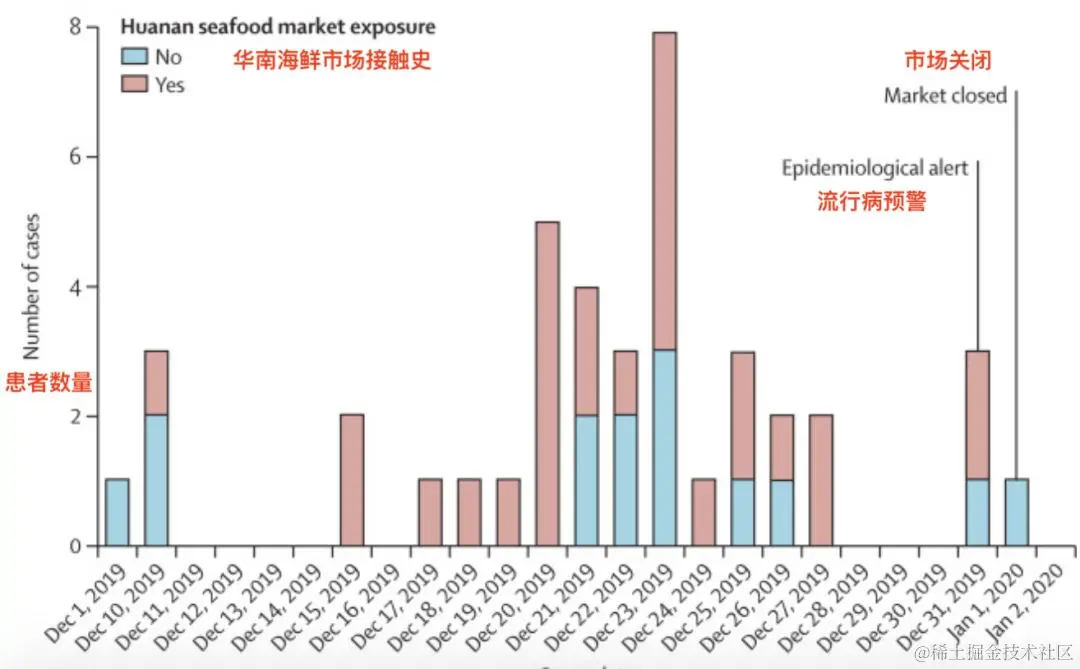 该论文发表于2020年1月24号(三天前),对前41个确诊的新型冠状病毒患者(2019年12月16日至2020年1月2日)进行了详细的病症观测和相关特征提取。论文中将本次新型冠状病毒命名为the 2019 novel coronavirus,简称2019-nCoV。