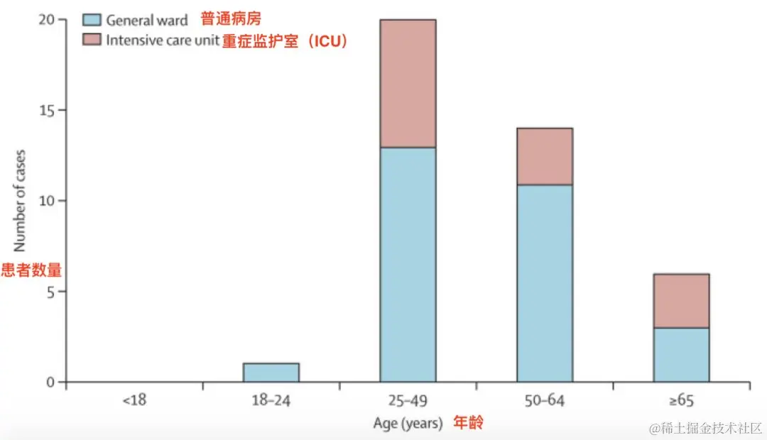 横坐标为年龄,纵坐标为患者数(蓝色为非重症患者数,红色为ICU重症患者数)。