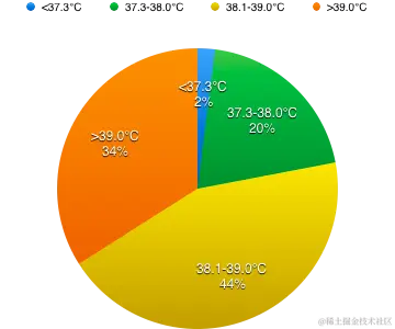 在所观测的41位患者中,98% 的患者有发烧症状,这是召回该病症的最强特征。具体的体温占比如下: